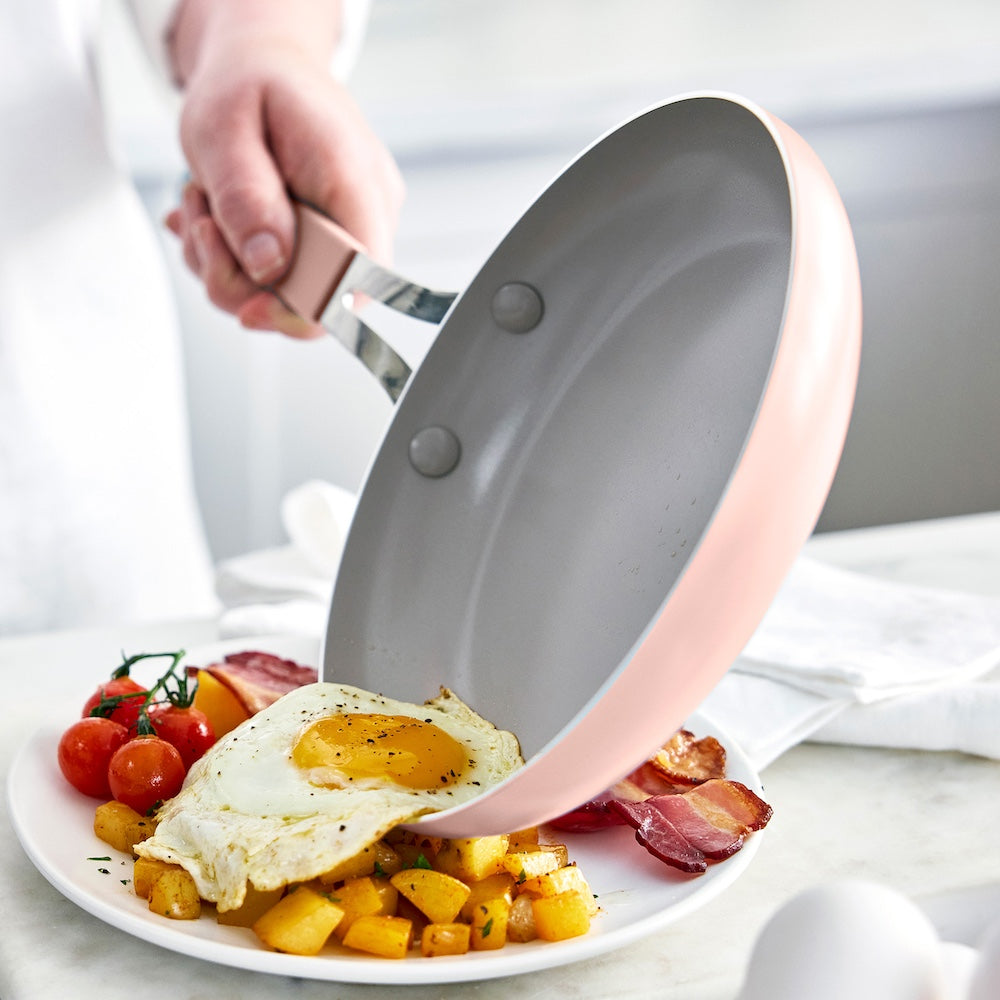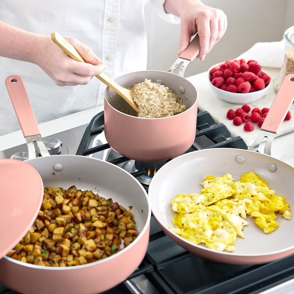 Experience GreenLife Dream, a stunning combination of power and elegance. Featuring a PFAS-free ceramic nonstick coating, GreenLife Dream delivers healthier meals without worry. Each pan is crafted from quick-heating aluminum for incredible strength and professional results. The stay-cool riveted handles offer a sturdy, comfortable grip while the vibrant colors instantly brighten up your kitchen. To make your culinary dreams come true, this collection is dishwasher safe, oven safe up to 390˚F, and features forged aluminum lids that lock in heat, moisture, and flavor.